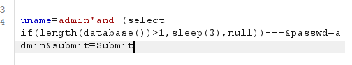 - 修改uname=后面的字段进行时间盲注判断注入点