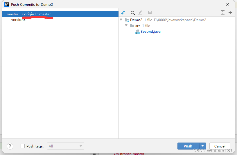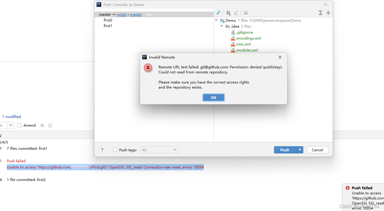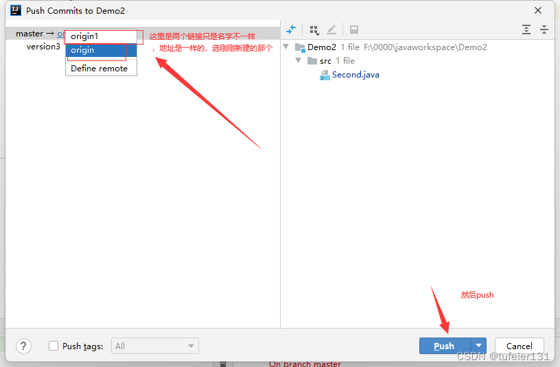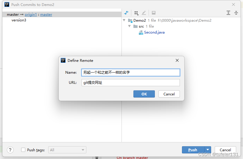 建立一个远程库地址的链接并起个名字部分 和 push部分(idea版本不同界面不一致请自行查找!)