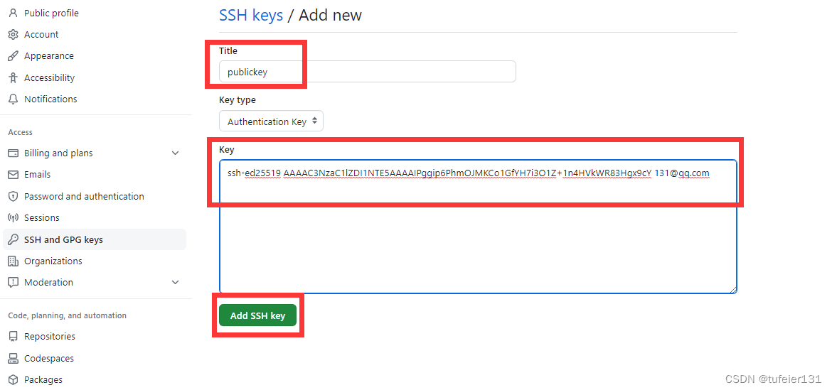 可以看到需要我们填写两个地方;Title的框 随便写一个就行,而key的框需要输入你生成的.pub文件里的内容,然后点击Add