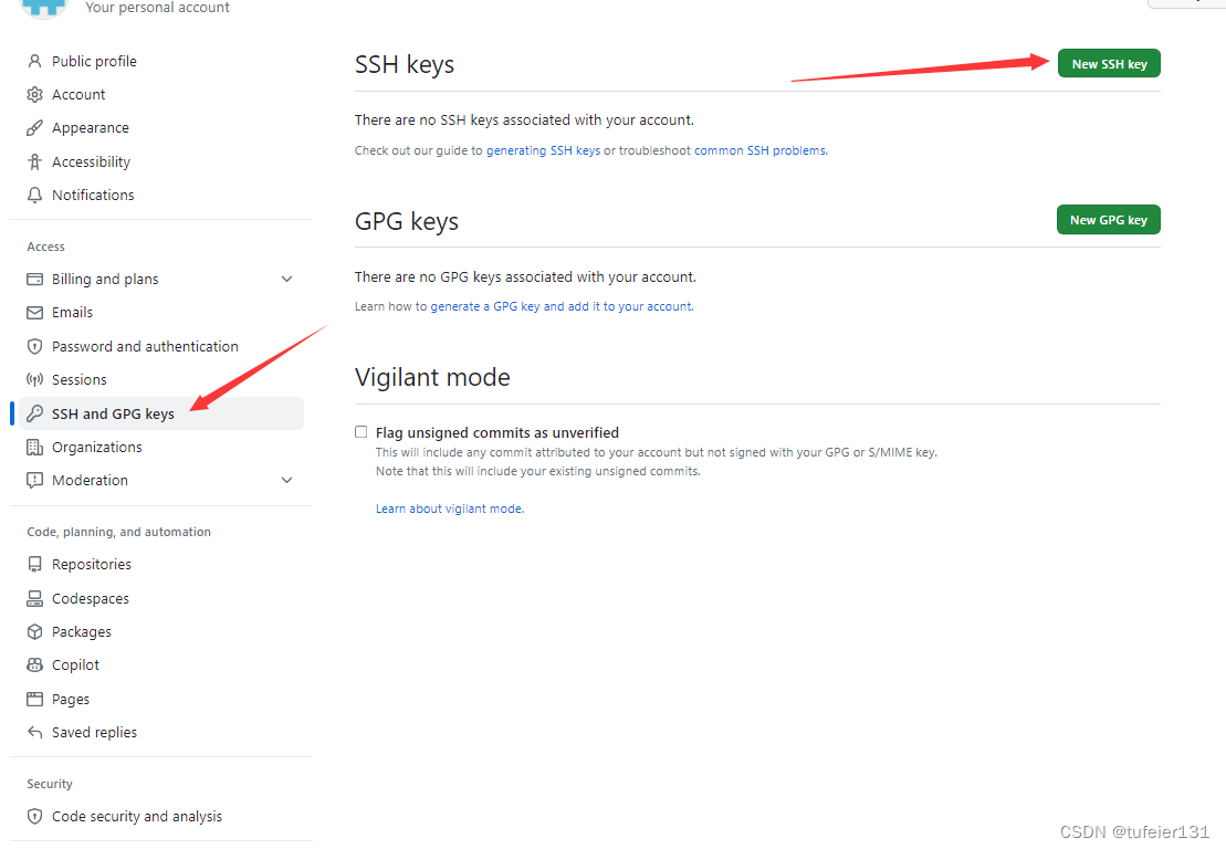 在左侧找到SSH and GPG keys ,再点击SSH key部分的New SSH key