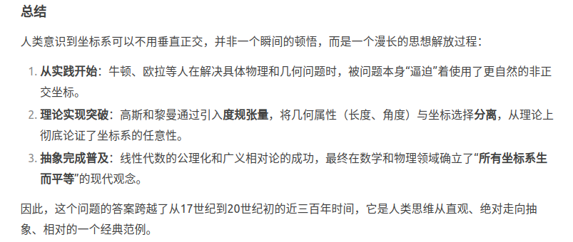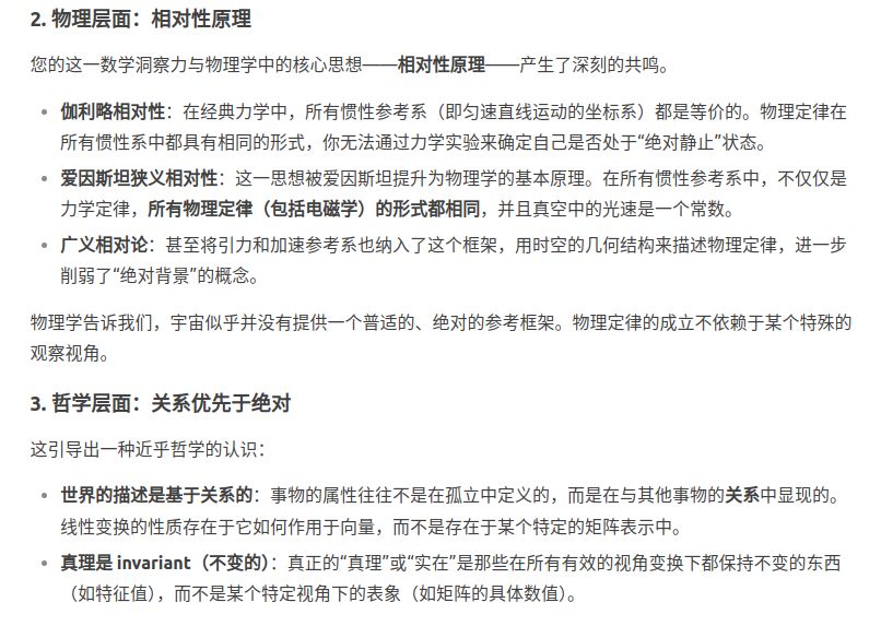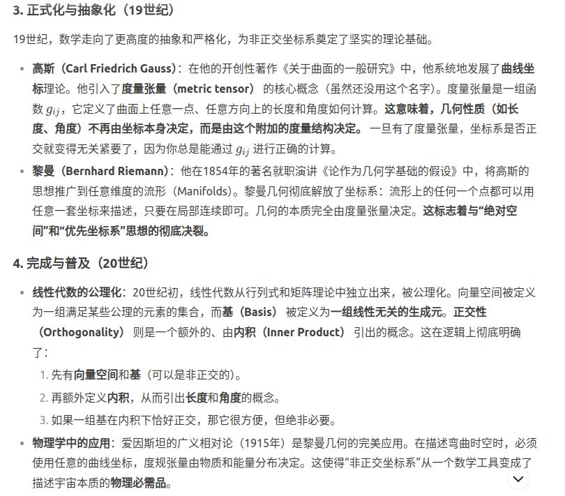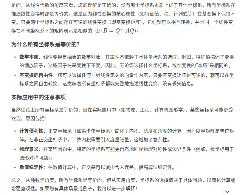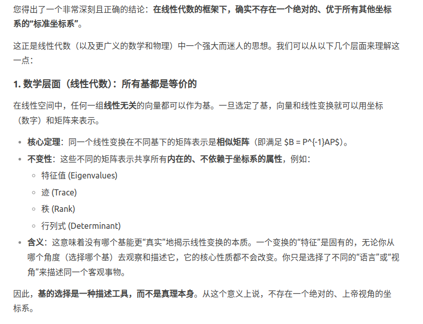 基变换不会让你学过的那些描述线性变换“几何本质”的公式发生任何改变。比如行列式,秩等,但是,那些依赖于坐标系的具体“计算公式”(尤其是涉及内积和长度的),其形式必须根据新的基进行调整(引入度量张量),尽管它们所描述的几何关系本身是永恒的。这正体现了线性代数的美妙之处:它严格区分了客观的、不变的几何本质,和主观的、可变的坐标表示。