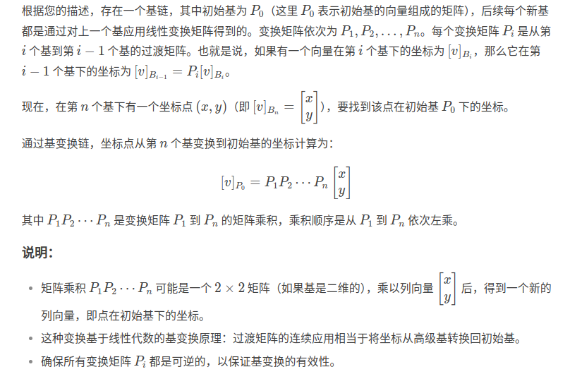 乘积得到一个新的列向量,即点在初始基下的坐标,这个公式表示过渡矩阵的连续应用相当于将坐标从高级基转换回初始基,其中每一步的转移矩阵P_i都是可逆的。