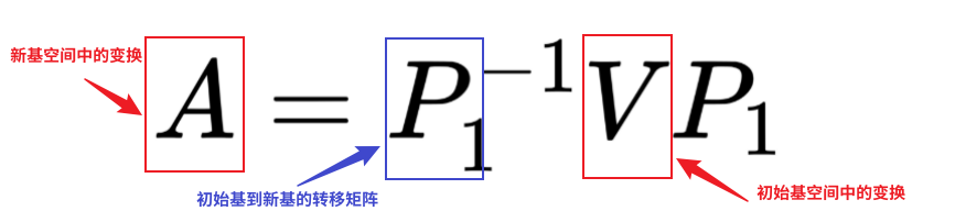 代表两个矩阵到V矩阵的相似变换,其本质是从线性变换V所在的基向线性变换A或B所在的基的过渡矩阵,初始基可以是任意的线性无关的基,不要求必须是单位正交基,对于任何初始机中的线性变换V,相似的形式都保持不变。