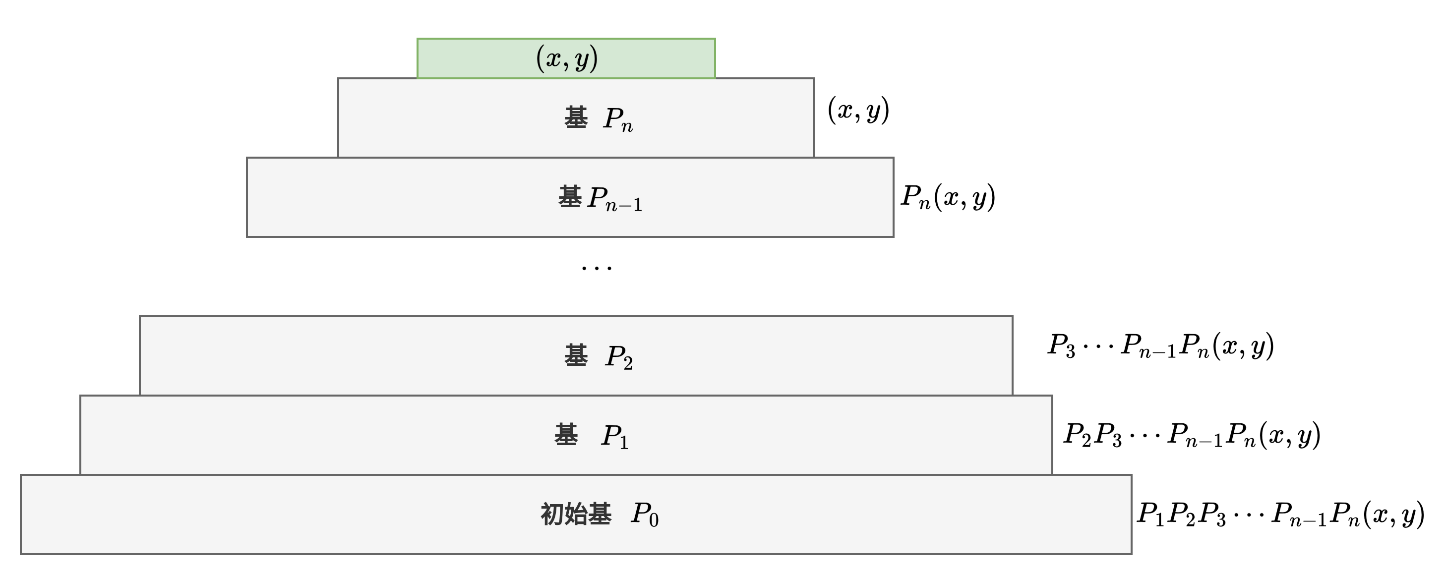 初始基可以是非正交基,不要求是标准正交基,抽象角度,对于坐标(x,y),满足如下金字塔坐标系的基变换公式,其中下一级的基变换矩阵是相对于上一级的坐标系而言的: