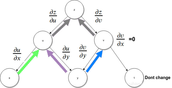 从计算图数据流向的角度,相当于每个图中每个终端节点(代表自变量)的微小变化反馈给顶层节点的过程,所谓蝴蝶效应,这里可以类比为变元x,y对z引发的蝴蝶效应,所以,从这种角度来看,可以按照下图中颜色箭头标识的路径来理解。