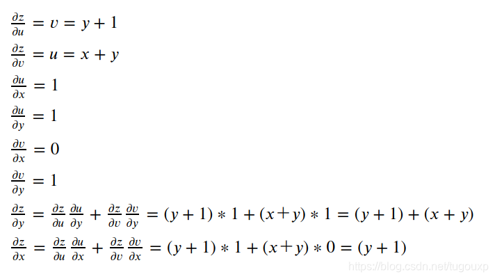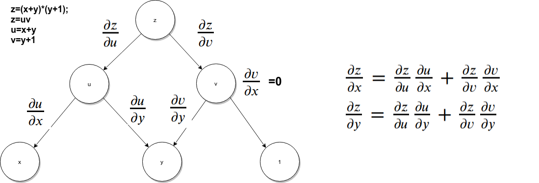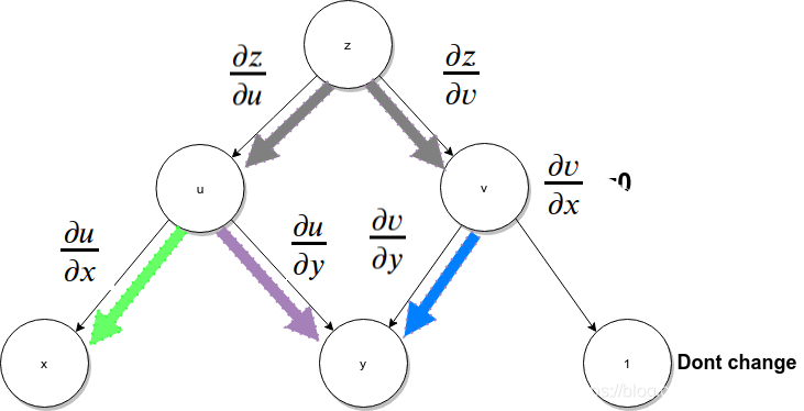 如果求上图中z对x,y的偏导(偏微分),等于x, y到顶点z所有路径的微分的和。步骤如下: