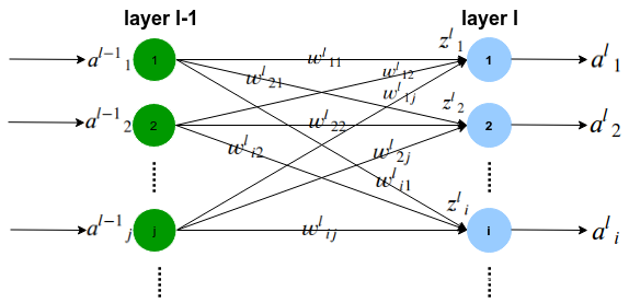 : l -1层的第j个节点 与 l层的第i个节点 的连接权重