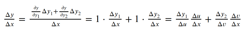 经过逐级放大,x的变化传递到y,根据链式求导法则: