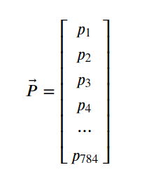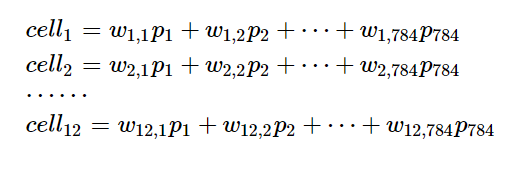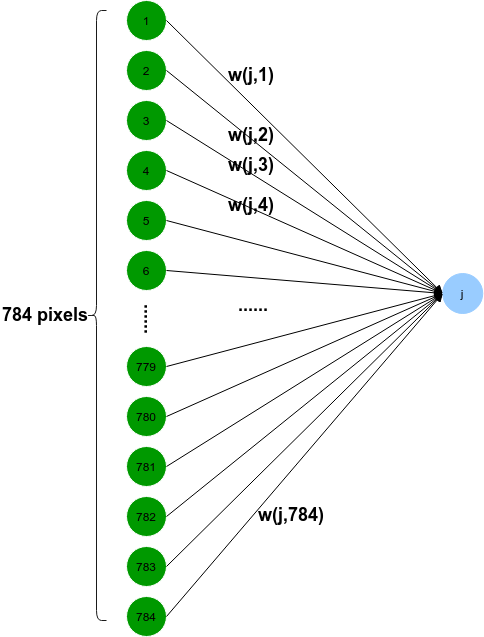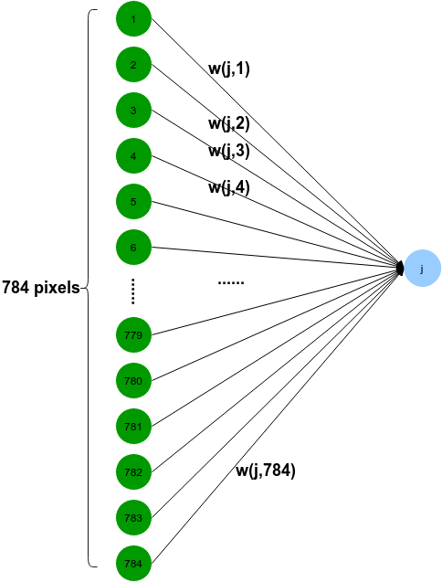 神经网络也是将各个独立的数据节点通过权重线连接在一起,充当数据节点之间突触的功能,在全连接网络中,每一个下级节点和上级的所有节点均有连接,以下图为例,一张图片上的所有像素点会被展开成一个1维向量输入网络,28 x 28的输入数据被展开成为784 x 1 的数据作为输入,其结构,简单示意图如下: