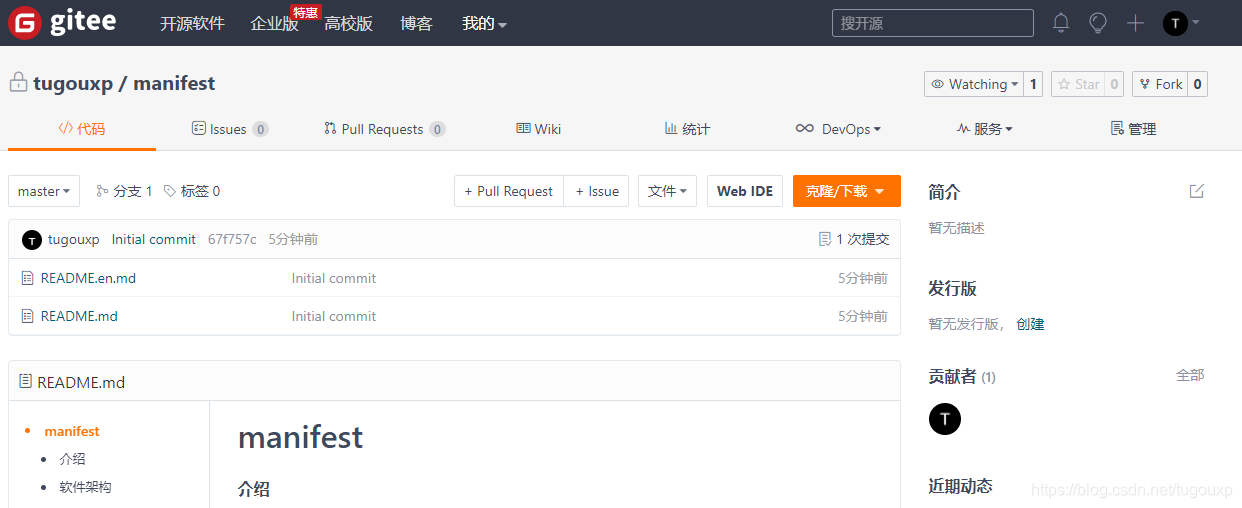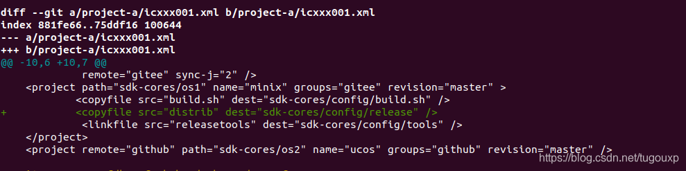 则以上xml定义的实际上是,拉取远程服务器https://gitee.com/tugouxp/(被重命名为gitee)下的子仓库"minix"项目,url为“https://gitee.com/tugouxp/minix",拉取分支是"master",并行两个线程拉取到本地,并且命名为 sdk-cores目录.编辑完成后,提交到服务器,此时manifest仓库的文件布局如下图: