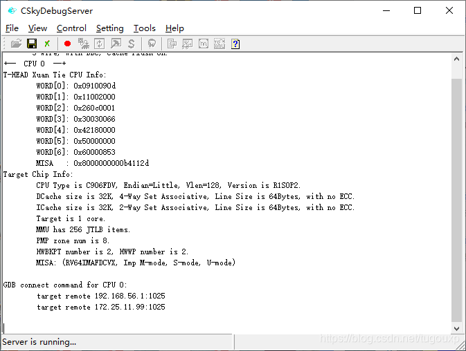 可以看到,cskydebugger已经正确连接到ICE并且识别到了平台,不仅如此,下面还给出了通过gdb连接的命令: