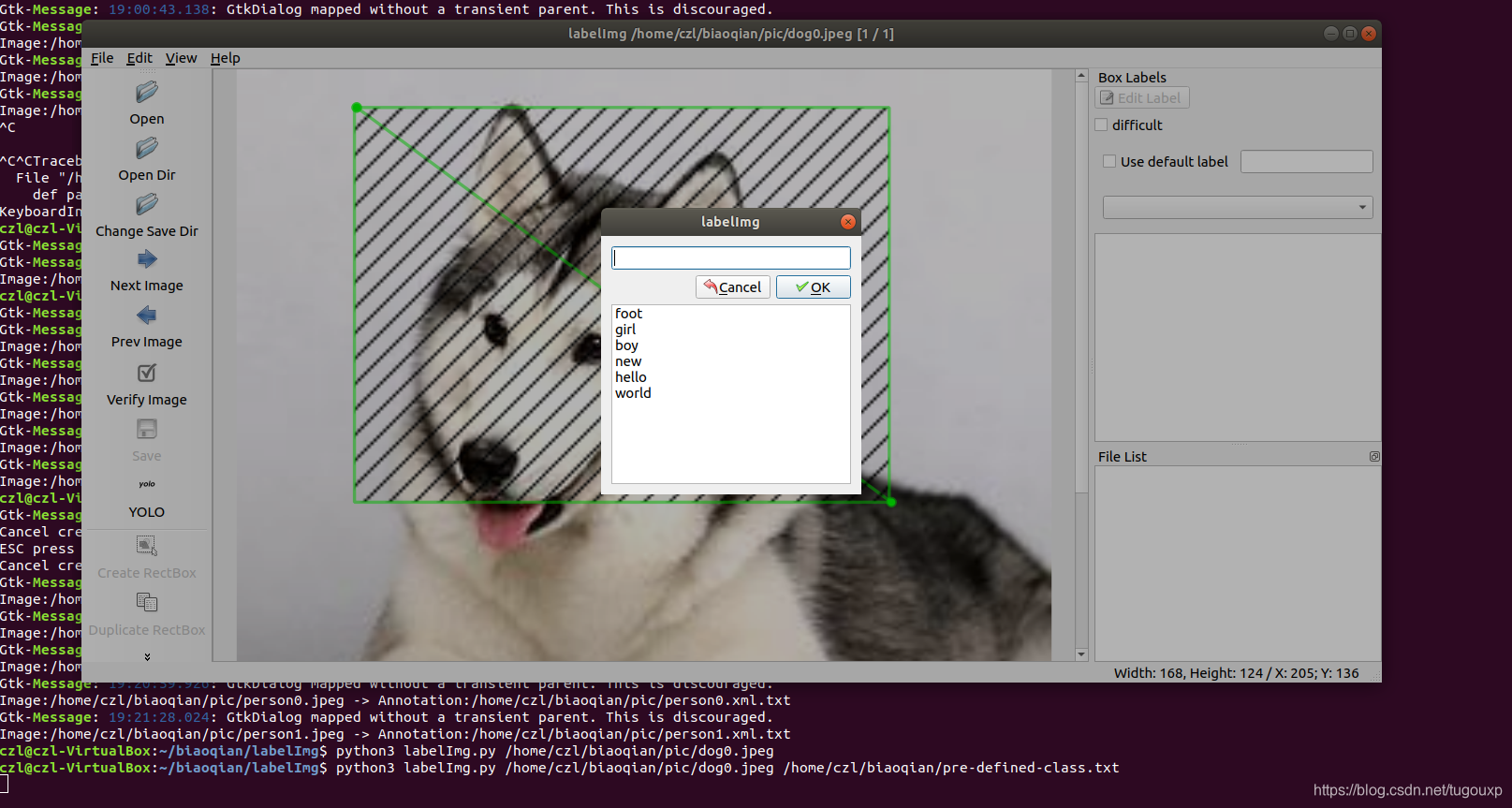 python3 labelImg.py /home/czl/biaoqian/pic/dog0.jpeg /home/czl/biaoqian/pre-defined-class.txt