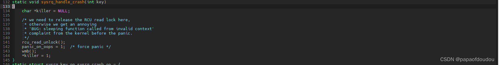 触发方式很简单,直接在空指针上写数据就可以了。需要注意的是这里的panic_on_oops,在内核中,是一个标志性的变量。