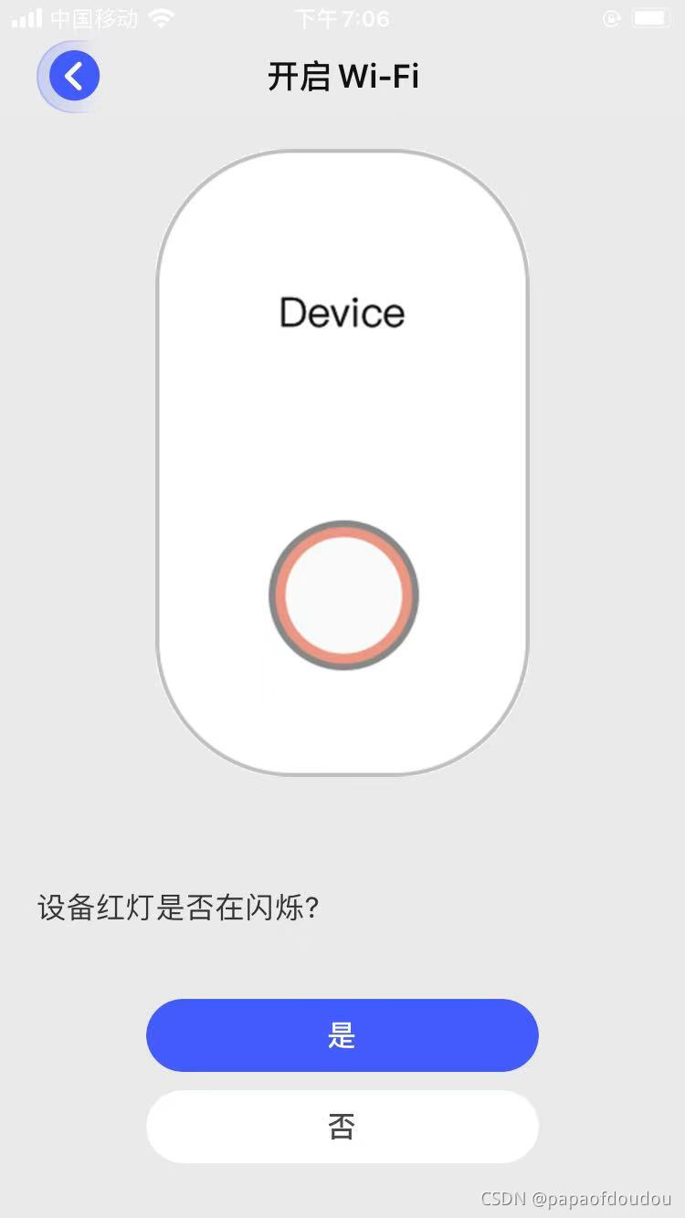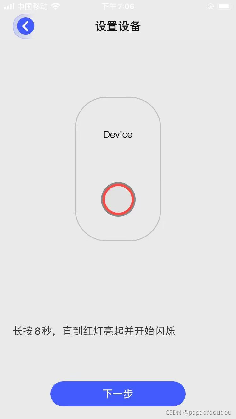 首先长按设备8秒,设备红灯开始闪烁,表示进入配网状态。不过我遇到的情况是,拔掉电池绝缘膜片后红灯就开始闪,没有执行长按8秒的操作。