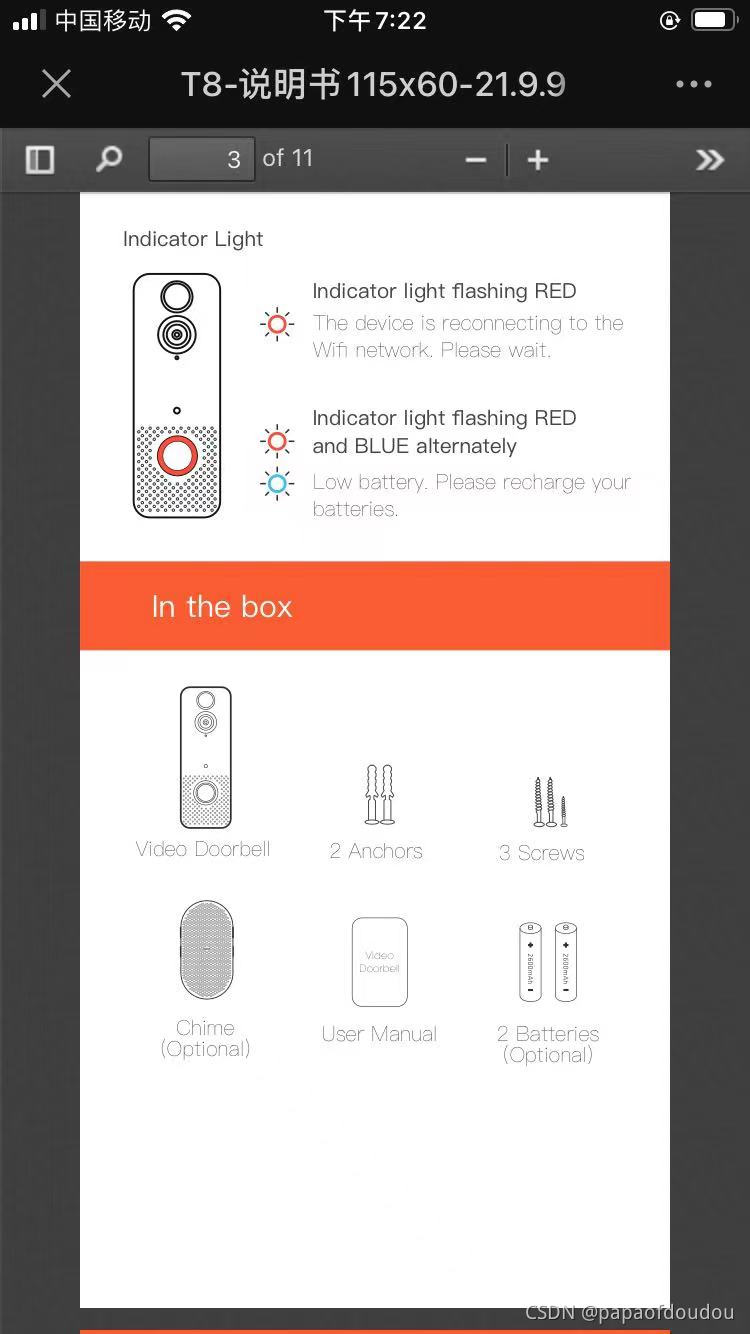 这篇文章试图对爱健的一款智能视频门铃的使用进行详细拆解,介绍其安装,使用的方法。值得一提的是这款摄像头使用了全志科技的Melis4.0方案,搭配V831主控,支持1080p H264/H265编码,其详细参数罗列如下: