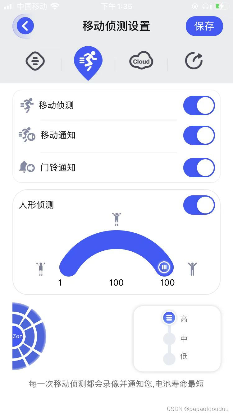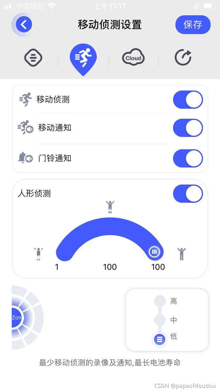 开启智能体验,包括移动侦测,红外体测,以及人形检测,从另一个方案得知,APP,云端和设备侧的配置,命令交互是通过.json格式完成的,端侧可以porting一个cJSON开源库实现对json配置文本的解析和上报平台。