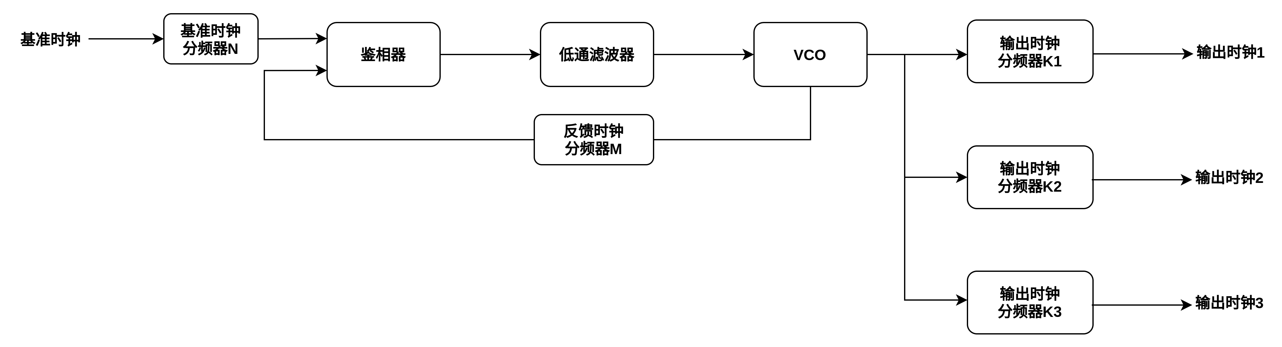 基准时钟在输入鉴相器之前要通过分频器,如果分频比为N,VCO的目标频率就为基准频率的1/N,另外反馈VCO的输出时钟到鉴相器的路径也追加了分频器,当这里的分频比为M时,反馈控制的目标就是让VCO振荡频率的1/M和目标频率一致,因此,基准时钟的频率和VCO的震荡频率的关系可以表示为: