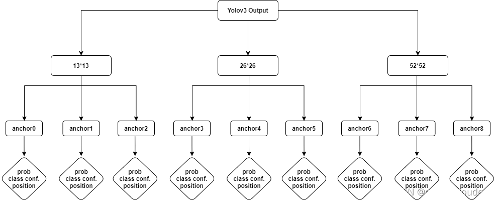 格局YOLOV3的检测原理,上面图中每张图像对应一个输出tensor,所以yolov3网络一共三个输出层,输出三个tensor用于后处理。