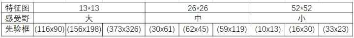 不同尺度的输出用于检测不同尺寸的物体,需要不同的 anchor box。以 COCO 数据集为例,9 种 box 尺寸如下 9个先验框是:(10x13),(16x30),(33x23),(30x61),(62x45),(59x119),(116x90),(156x198),(373x326)