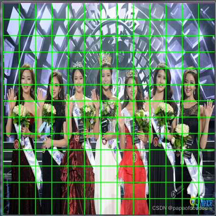 我们知道,根据YOLOV3论文中的说法,以416X416尺寸的输入图像为例,YOLOV3是将其按照 13x13,26x16,52x52分割成小块,如下图的样子,用示意图表示如下,原图尺寸是1200x741.