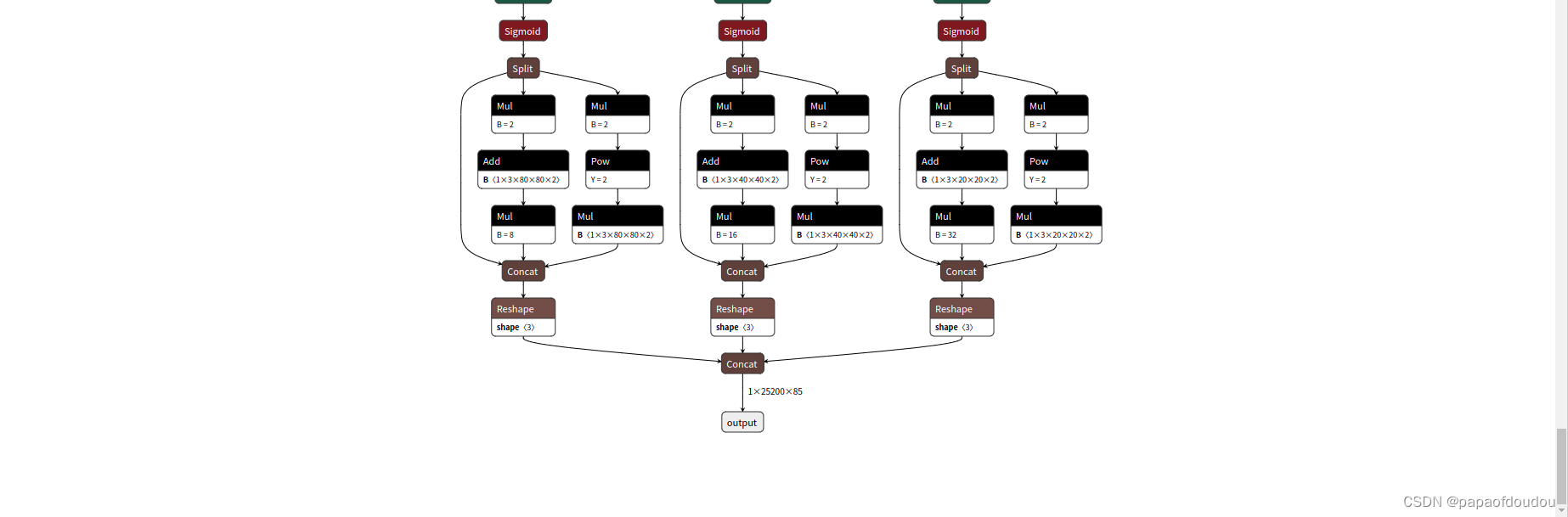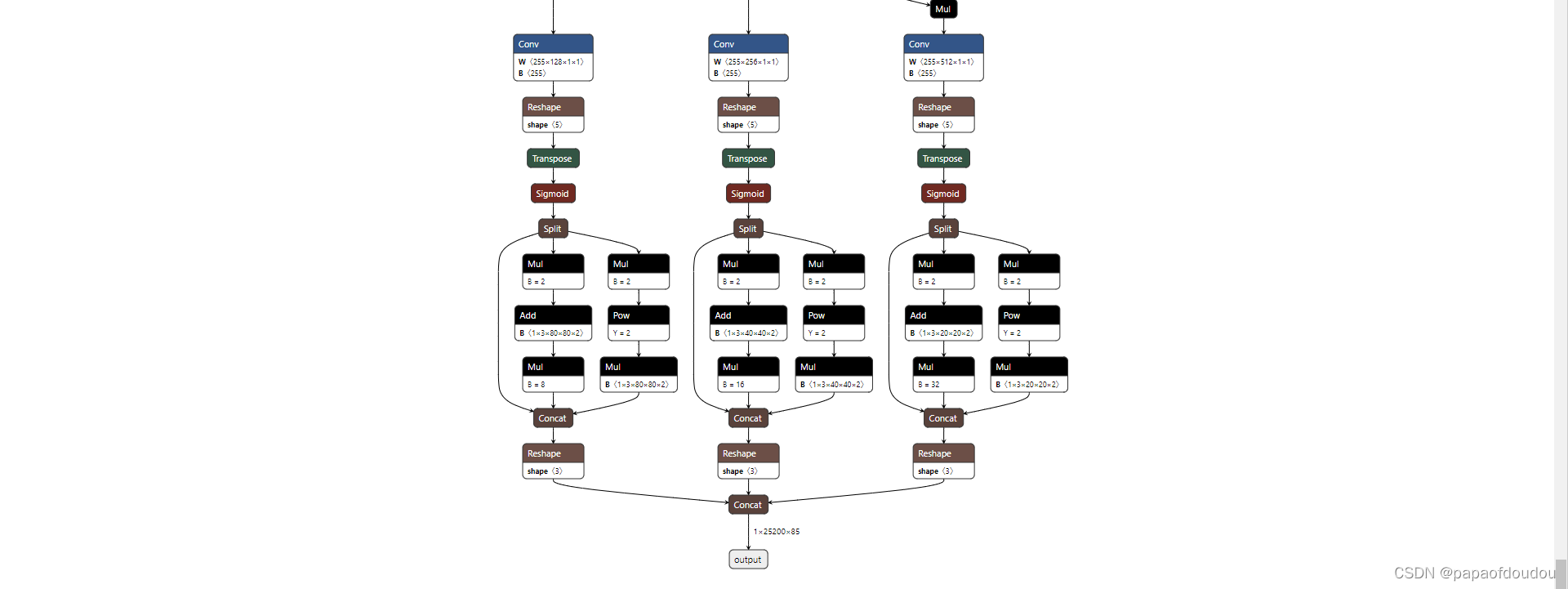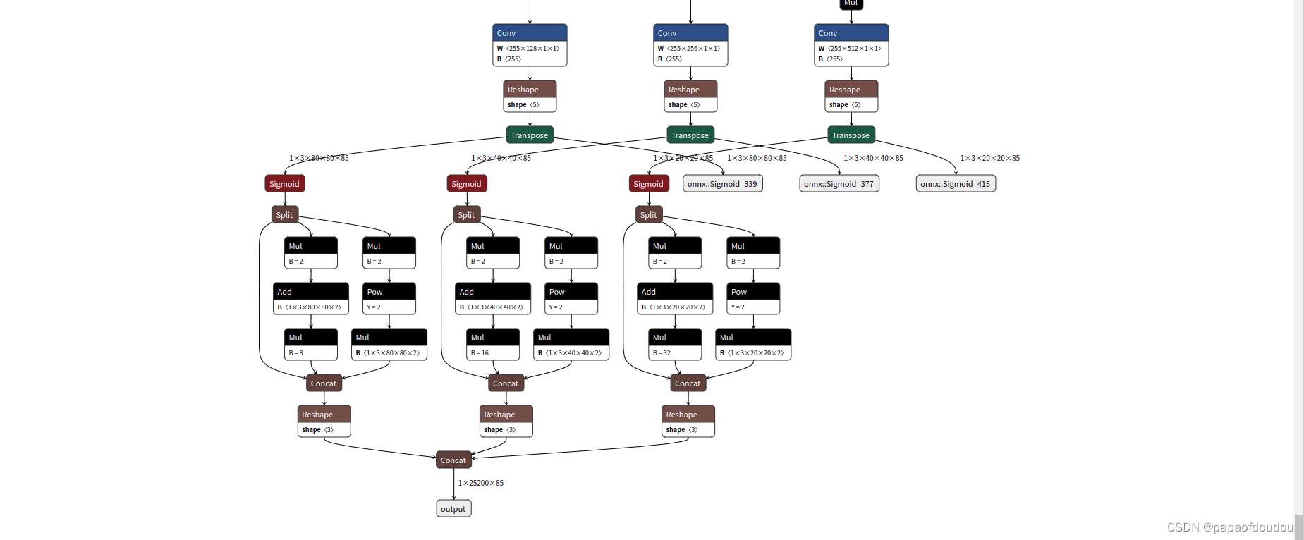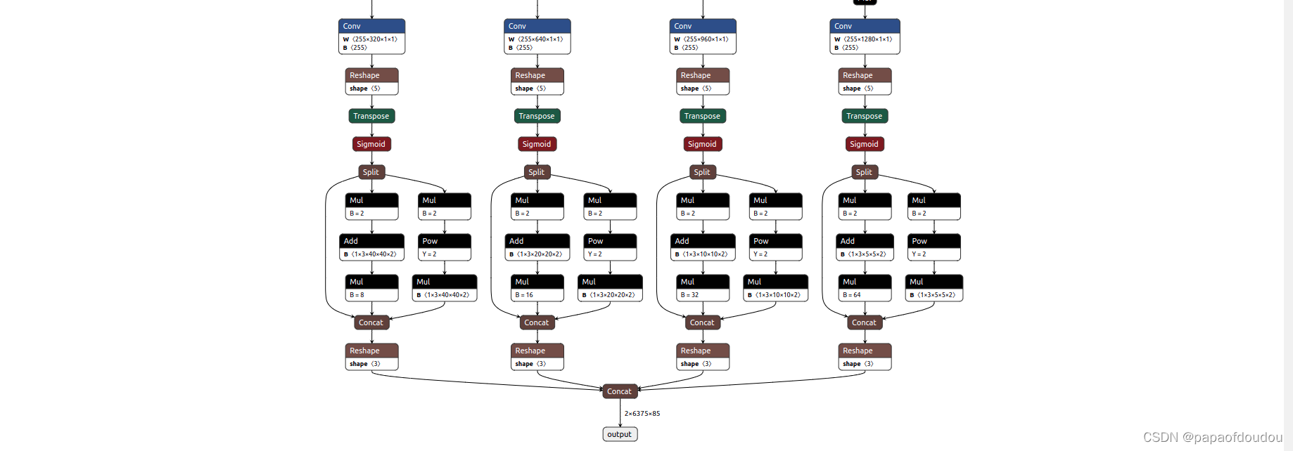 YOLOV5S默认的输出如下,结构上三路分支在最终的输出点合并为一路输出,导龙入海,引火归原,但是这些层并不适合NPU做后处理,原因是中间有很多超越函数的操作。一般做法是从输出头那边引出输出节点,而不是将三路输出汇总为一路输出。
