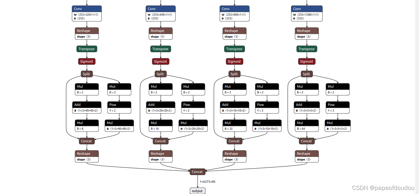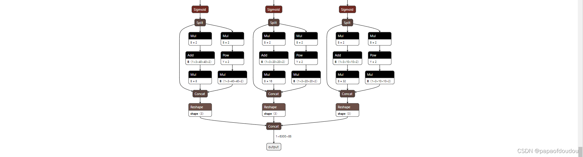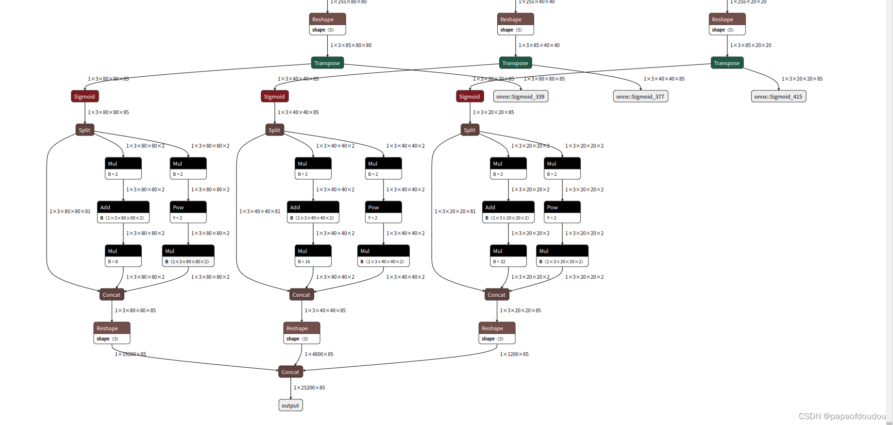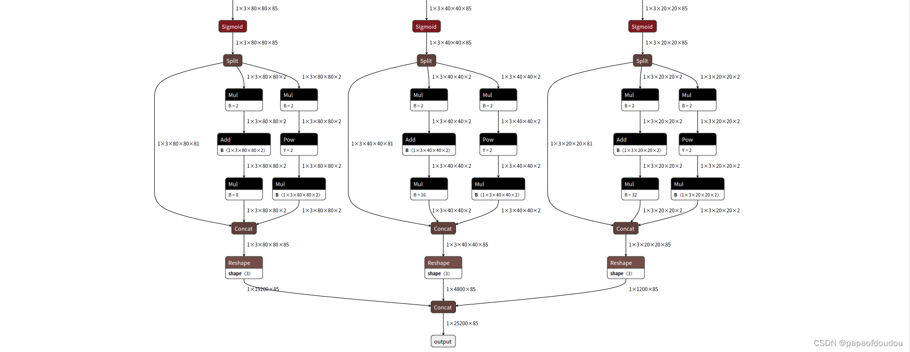 YOLOV5S默认的输出如下,结构上三路分支在最终的输出点合并为一路输出,导龙入海,引火归原,但是这些层并不适合NPU做后处理,原因是中间有很多超越函数的操作。一般做法是从输出头那边引出输出节点,而不是将三路输出汇总为一路输出。