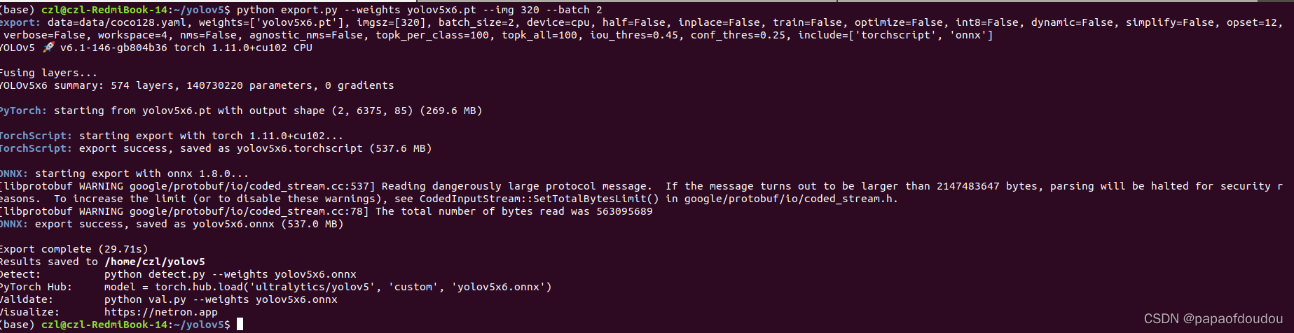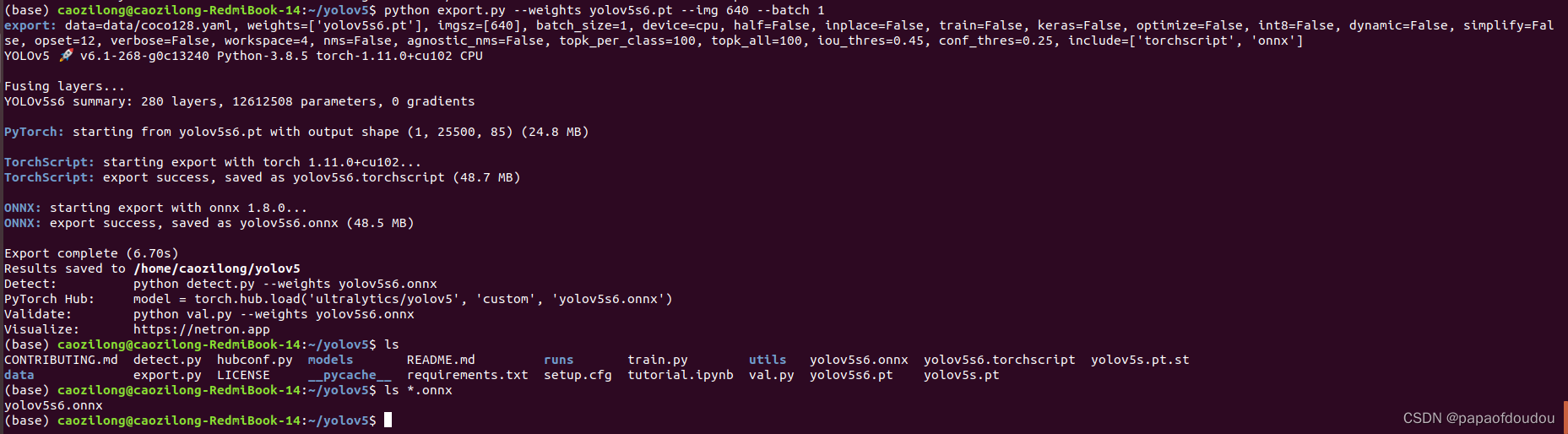 python export.py --weights yolov5s6.pt --img 640 --batch 1