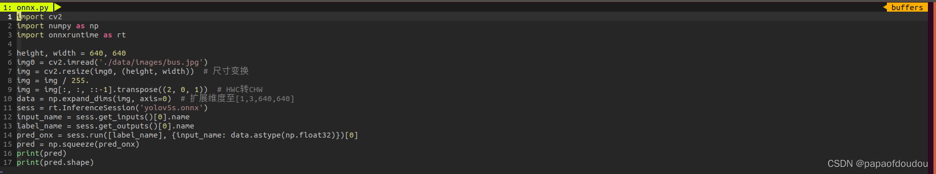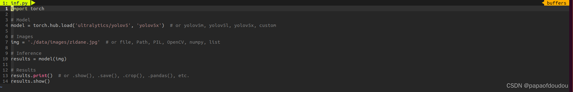 由于我们已经将YOLOV5的pytorch训练框架下载过来,接下来我们就可以编写代码来完成推理了,代码如下所示: