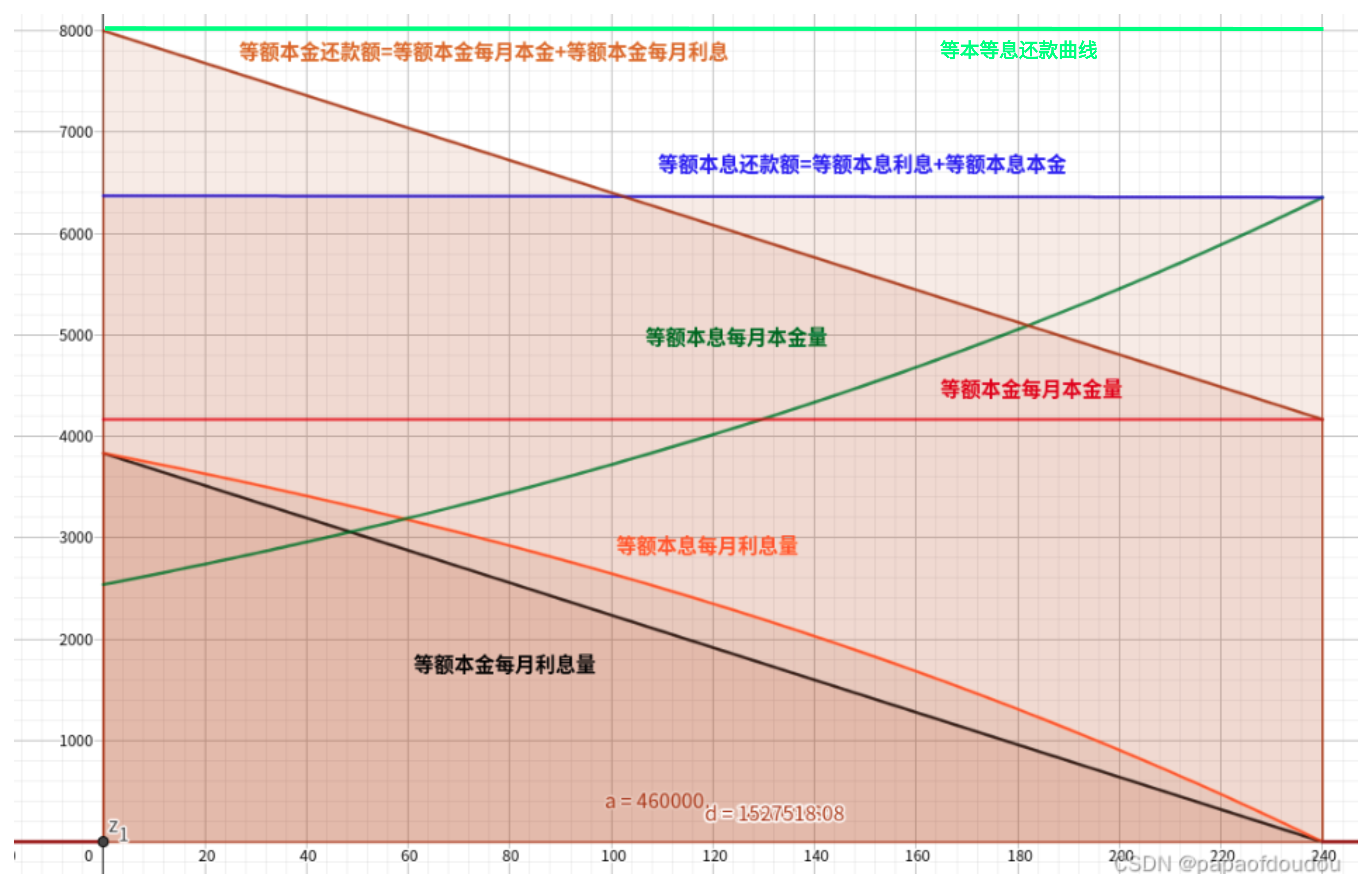 由于等额本息每月还款数额相同,所以上面两幅图是互补的。