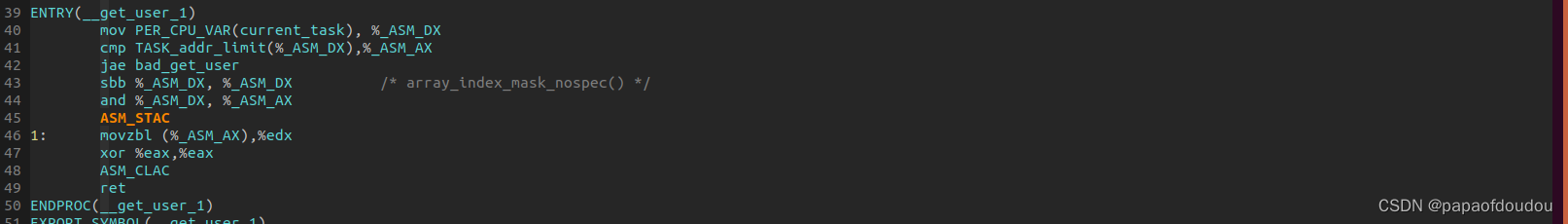 以get_user为例,其它宏定义实现类似,在get_user的核心实现__get_user_1中,在进行真正的用户态指针访问前后,程序调用了ASM_STAC/ASM_CLAC去打开/关闭内核访问用户地址空间权限的功能: