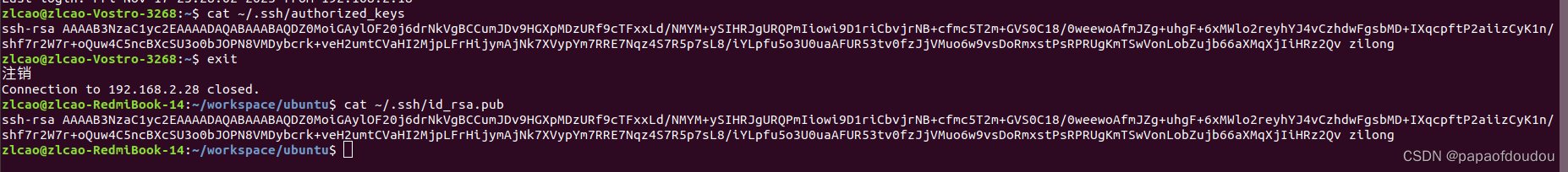 另外,登陆到远程主机上后,查看~/.ssh/authorized_keys文件的内容,发现和本地生成的公钥完全一致,所以可以知道前面执行的ssh-copy-id命令实际上是将公钥文件案拷贝到远程主机。
