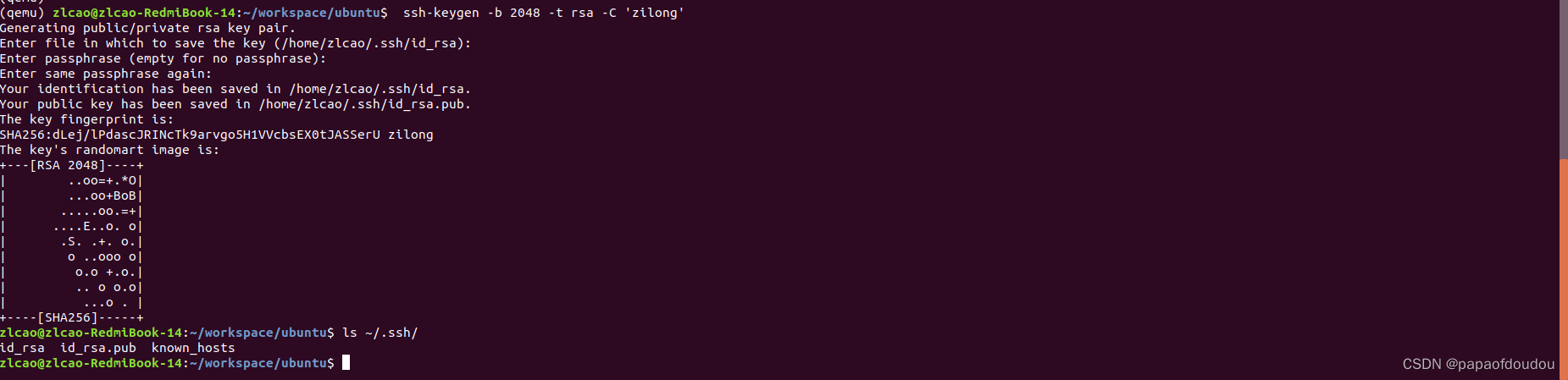 直接生成公私钥,默认存放在$HOME/.ssh目录下,公钥文件名默认为id_rsa.pub ,私钥文件名默认为id_rsa。默认生成是通过rsa算法加密的: