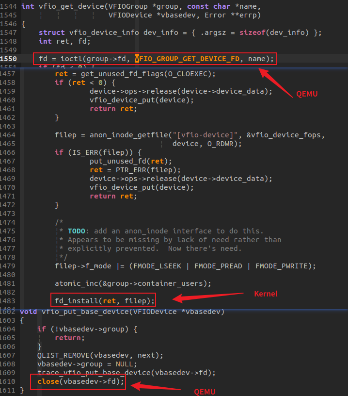 VFIO 字符设备的例子,QEMU调用内核VFIO_GROUP_GET_DEVICE_FD产生了一个引用计数,QEMU主动调用close(fd)关闭。