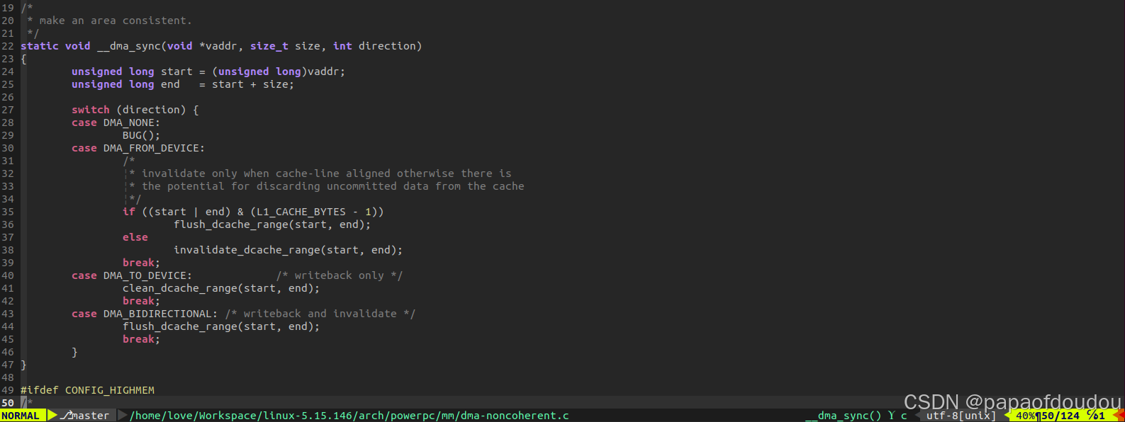 内核提供的dma_map_single/dma_map_page等函数会调用各CPU体系结构提供的arch_sync_dma_for_device函数,对于这个函数的实现,PowerPC体系结构的代码写的比较清晰,可以参考,下面是对这段代码的解释: