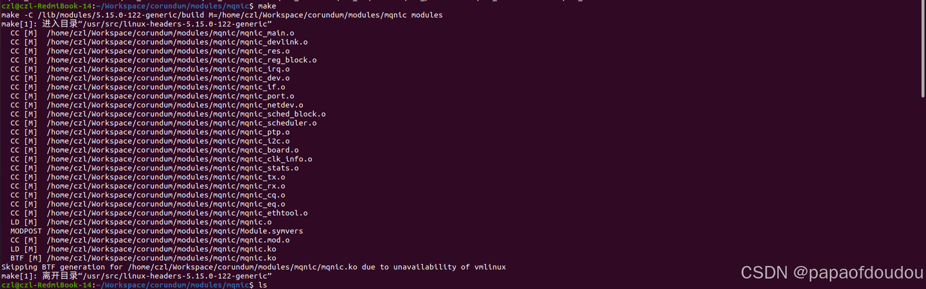 在Ubuntu 20.04.6 LTS,内核版本5.15.0-122-generic上编译,进入corundum/modules/mqnic目录,执行make 编译: