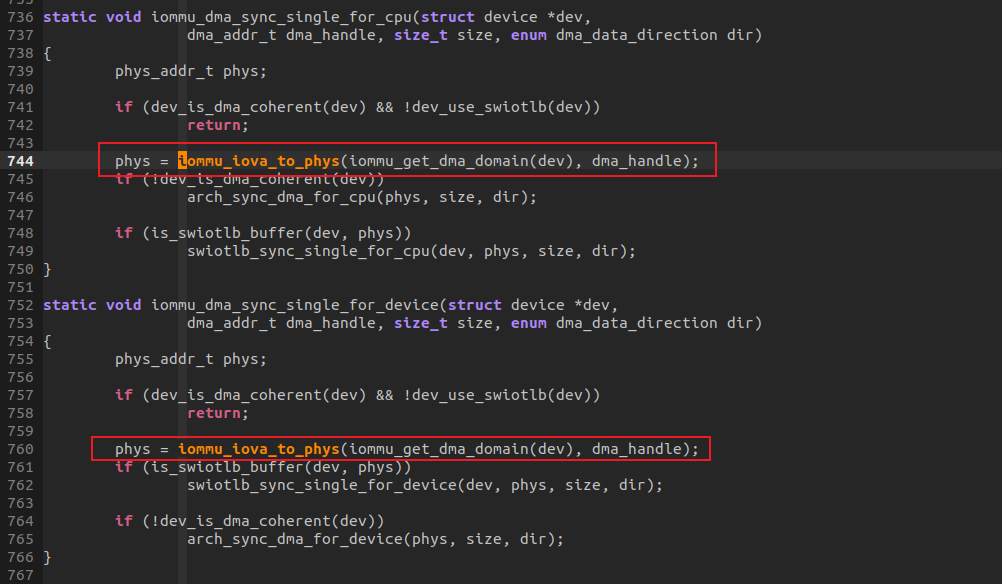 dma_sync_single_range_for_cpu/dma_sync_single_range_for_device/dma_sync_sgtable_for_cpu/dma_sync_sgtable_for_device进行CACHE一致性操作的指令使用的是BUF 物理地址,但是函数传入的时候,使用的dma_addr(iova)或者SGTABLE,函数内部会进行转换。