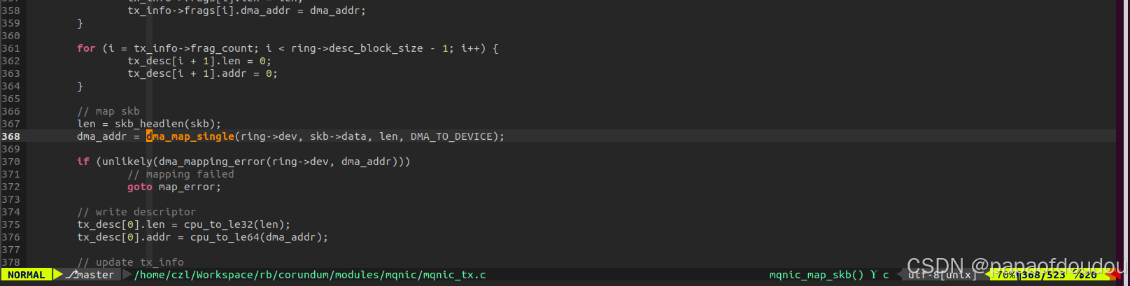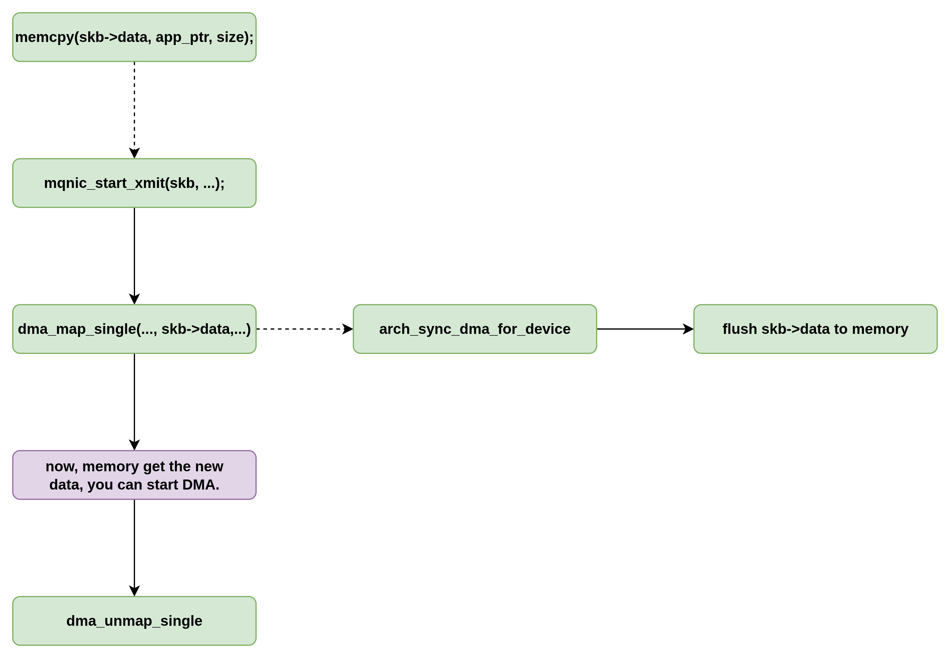 比如,对于发送处理来说,mqnic_start_xmit->mqnic_map_skb->dma_map_single(ring->dev, skb->data, len, DMA_TO_DEVICE);DMA_TO_DEVICE其作用告知CPU刷新一次CACHE,如果CACHE中有这段地址的脏数据,就把CACHE LINE中的数据回刷主机内存,这样硬件才能确保从主机内存读到最新的数据,协议栈在分配内存的时候,并不知道某个数据包是否要被硬件读取,因此并没有向分配一致性DMA缓存那样DISABLE CPU页表的CACHE属性。数据包所在的内icun通常都是使能CACHE的。