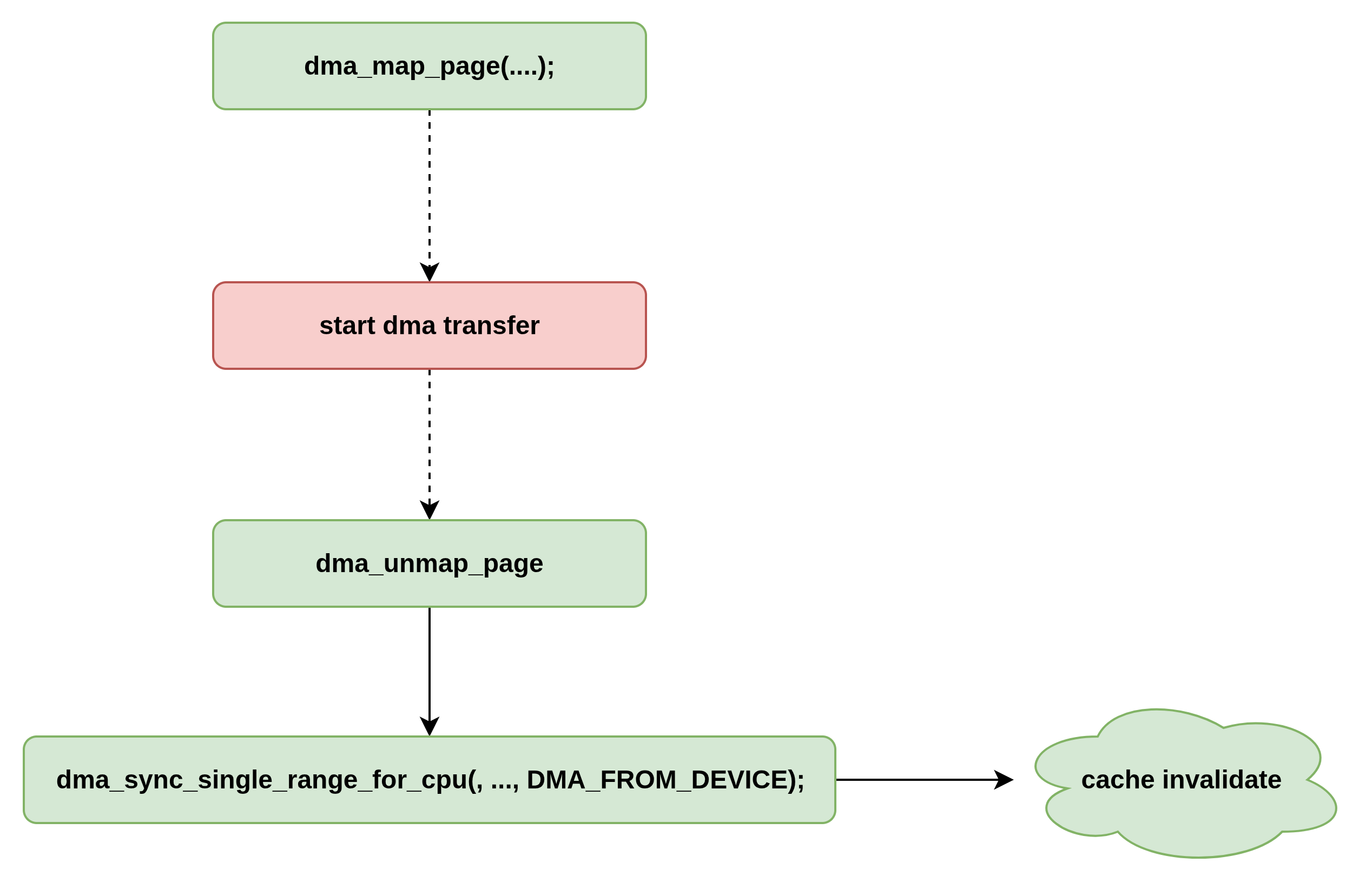 DMA_FROM_DEVICE其作用是驱动程序申请一段缓存给硬件填充数据,为了保证CPU能够读取硬件写入的数据,需要这个参数告诉dma_map_page函数,在调用路径中“invalid cpu data cache"就是将数据CACHE中和这段地址相关的CACHELINE设置为无效,这样CPU之后直接从主机内存中读取这段地址中的数据,就是硬件最新写入的。