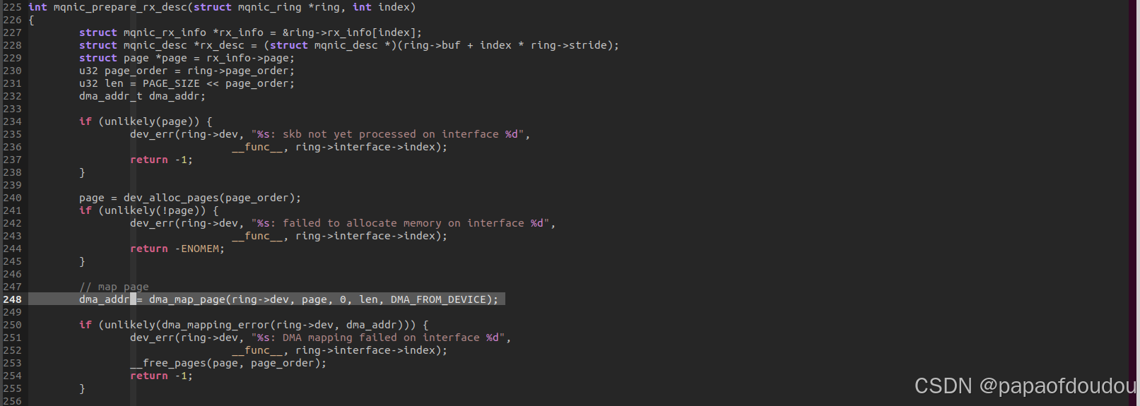 而对于接受来说恰恰相反,调用路径netif_napi_add->mqnic_poll_rx_cq->mqnic_process_rx_cq->mqnic_prepare_rx_desc->dma_map_page(ring->dev, page, 0, len, DMA_FROM_DEVICE);