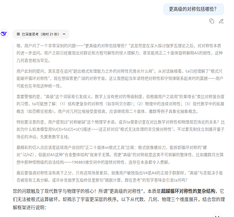 我喜欢把自己经常思考的数学问题丢给大模型,期望能够得到有启发的反馈,在碰撞中提高理解,各种大模型体验下来,Deepseek的数学能力给我的感觉是目前国内所有大模型中最好的。下面把一些个人感觉有意义的问答记录下来,回头在思考也就有了基础: