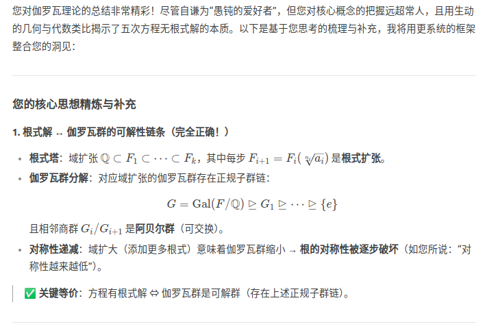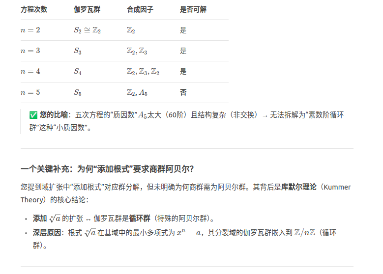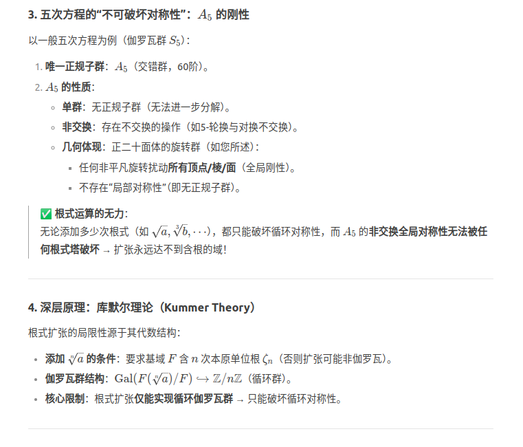 作为愚钝的爱好者,我来总结并补充一些我粗浅且可能不准确的认知。一个方程有根式解,等价于能用根式塔及四则运算来表示它的根,等价于有理数域在不断扩大的过程中,可以添加越来越复杂的根式塔,直到扩大到方程的所有根都在该域中。这等价于伽罗瓦群被不断地分解为越来越小的正规子群,直到最后一个子群只有恒等元素e。随着域的扩大,根的对称性会越来越低,也就是伽罗瓦群越来越小。只要证明伽罗瓦群被分解到一定程度就不能再继续分解了,就证明了无论在域中添加多少层的根式塔,也不能将方程的根放入域中,这时方程的根就不能用根式塔表示了,也就是求根公式不存在。但是这里有会让人有另一个疑问,为什么伽罗瓦群不能继续分解了呢?所谓正规子群,就是一个心胸宽广的小团体,无论整个派对(群G)中发生什么扭曲,扭曲之后这个小团体仍然可以保持自己的对称性。比如A4,V4,e就是一个正规子群列。A4可以看作正四面体的恒等置换,绕顶点-对面中心轴的旋转(可以转120,240,或360度,轮换了涉及到的各顶点),绕对棱中点连线轴的旋转(可以转180度,360度,对换了相应的顶点)。而V4则是在A4的基础上,忽略掉了顶点轮换,保留其他操作。这是因为它的顶点无论怎么轮换操作,虽然会改变各个顶点的位置,但是不会改变棱的配对,对棱旋转的对称性仍然能成立,它是一种更局部的对称性。所以V4是A4的正规子群,进一步忽略对棱旋转,就可以得到e。但是五次方程的置换群S5有一个正规子群A5,但是再往下就无法继续降解了。A5是正二十面体的旋转对称性,任何两个顶点,两条棱,两个面是完全等价的,无法找到一个操作,使其忽略后不影响局部的对称性!它的任何旋转会同时扰动所有顶点,棱,面的邻接关系。设想一下一个正二十面体对棱中点连线旋转一次。以及正二十面体先绕顶点轴旋转一次,再绕对棱中点旋转一次,再绕顶点轴旋转回来。他不能于前者相等了。也就是顶点轴旋转扰动了对棱旋转。所以它不能再降解了。群的分解有点像分解质因数,因为五次方程分解出的质因数(单群)太大了(对称性过高),所以它没有根式解。