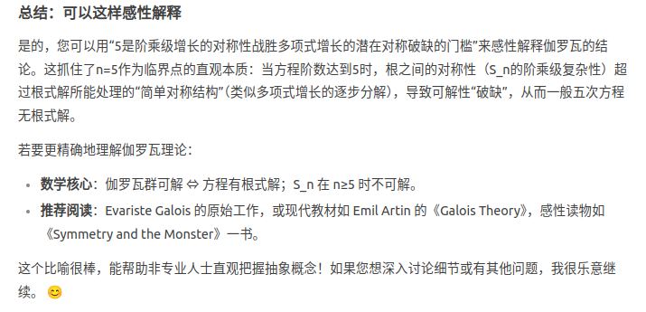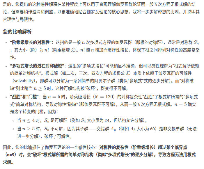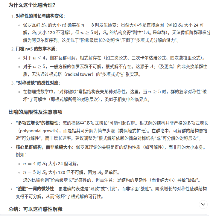 为什么5这么特殊?5刚好是阶乘级增长的对称性战胜开方运算破坏对称性能力的临界点,可以这样感性解释伽罗瓦的群论证明一般五次方程无根式解的结论吗?