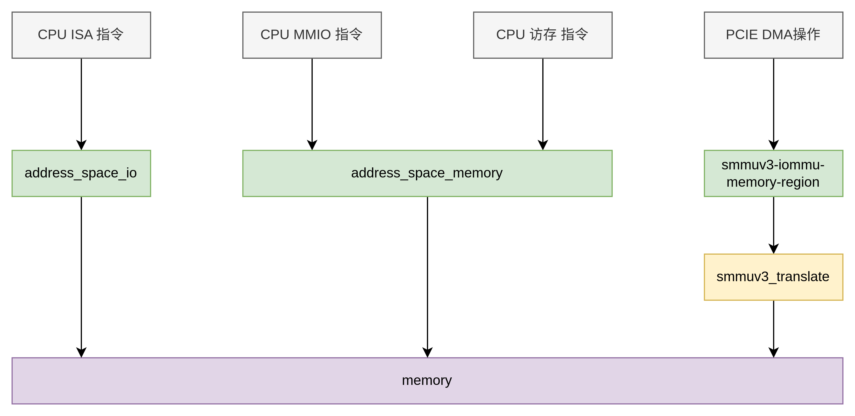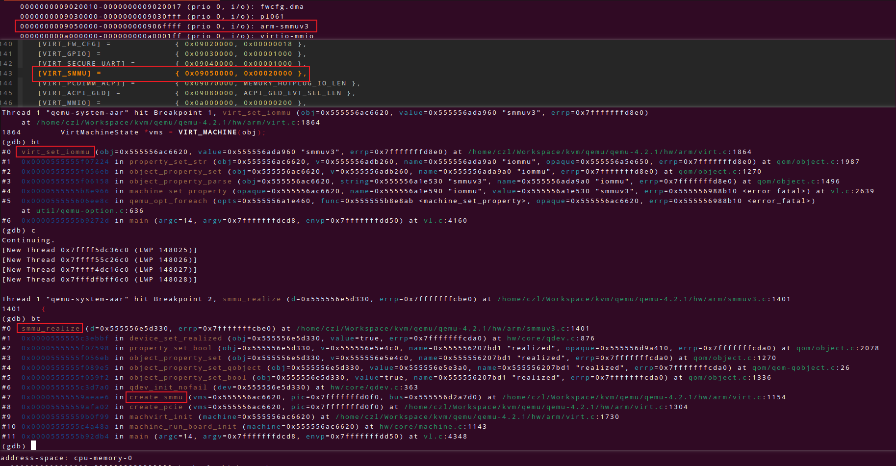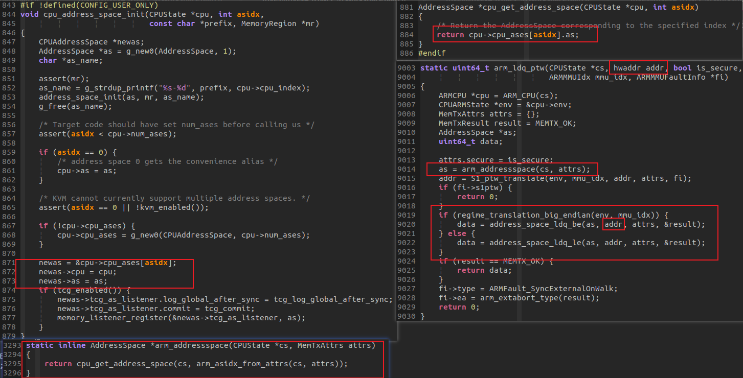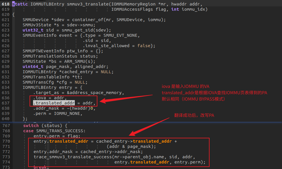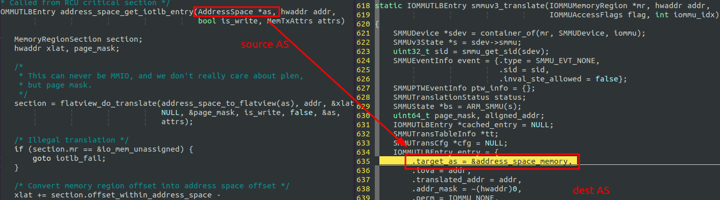 qemu-4.2.1/hw/arm/smmuv3.c实现了SMMU的模拟设备,其中函数smmuv3_translate则是SMMU将IOVA翻译为PA的核心函数,它是只有是在来自于IOMMU Address Space的访问请求时才会被调用到, QEMU下,cpu 视图下的address space和address_space_memory完全一样,或许这是CPU在计算机系统中的超然地位决定的: