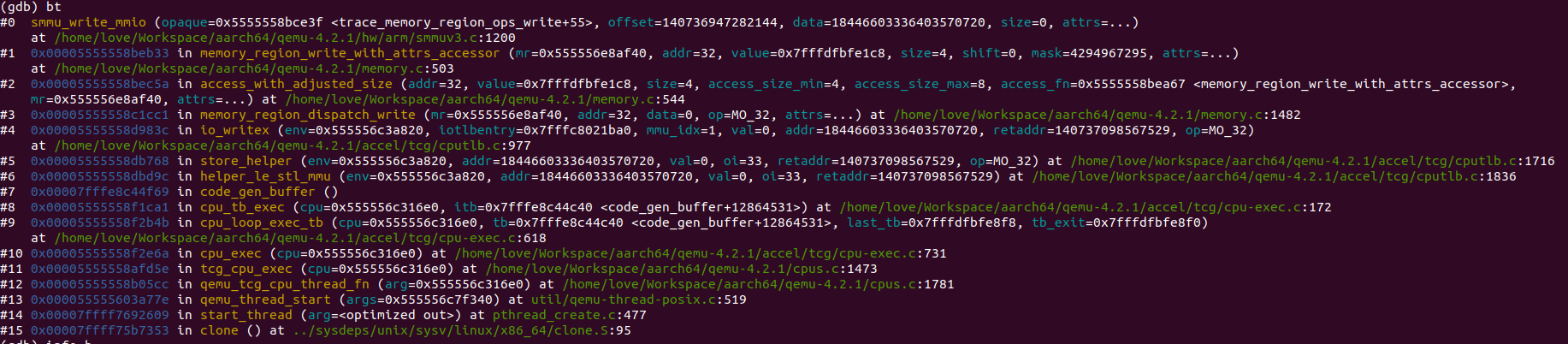 QEMU对SMMU的支持遵循典型的虚拟机“写IO->陷出->模拟”范式,下图表示的堆栈是虚拟LINUX系统在进行SMMU驱动探测过程中,配置SMMU寄存器导致陷出TCG进行模拟的流程: