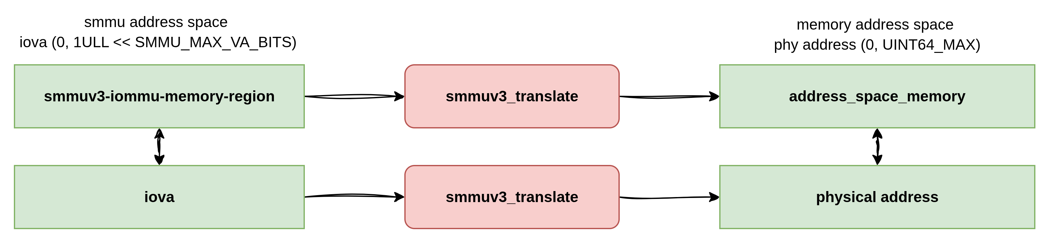 MMU的翻译本质上是两个address space对象之间的翻译,就IOMMU来说,其翻译的源地址空间是上图中的smmuv3-iommu, 目标地址空间则是物理地址空间address_space_memory。